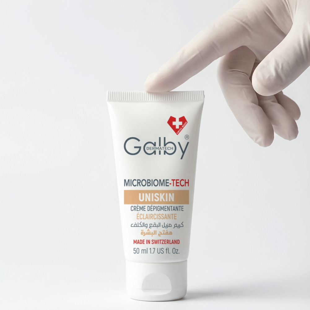 Crème Dépigmentante Eclaircissante UNISKIN de Galby Dermatech avec sa texture légère et soyeuse pour tout type de peau , combine la technologie du microbiome avec des actifs dépigmentants pour une action complète. Il unifie le teint pour révéler une peau visiblement plus claire et lumineuse. Adoptez une routine de soin qui optimise votre éclat naturel tout en protégeant votre peau.